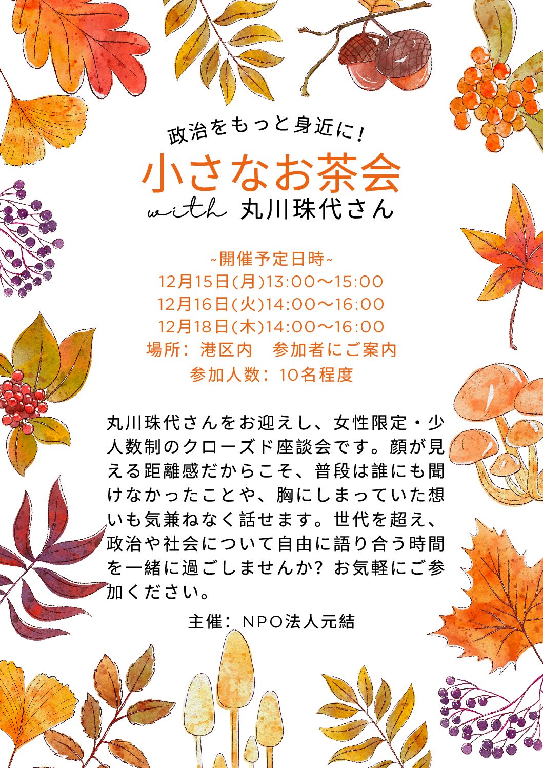 2025年12月 渋谷区・港区にて、自民党の 丸川珠代 さんをお招きし、「小さなお茶会」を開催いたしました。日頃なかなか直接聞くことのできない最近の政治の話題について、身近な視点でお話しいただき、参加者の皆さんにとって学びの多…